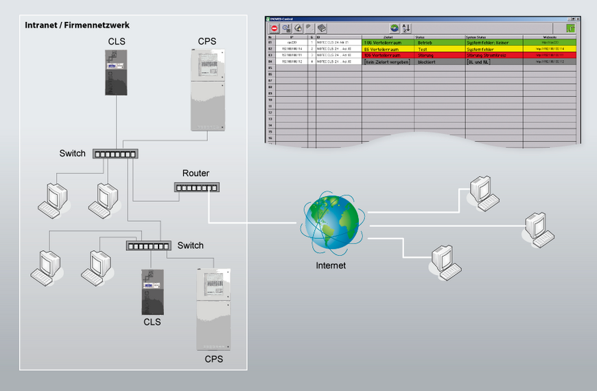 Komfortní řídicí jednotka TFT s integrovanou funkcí INOWEB pro centralizované monitorování systému nouzového osvětlení CPS 220/64 prostřednictvím intranetu/internetu. Pro připojení se využívá stávající síť.